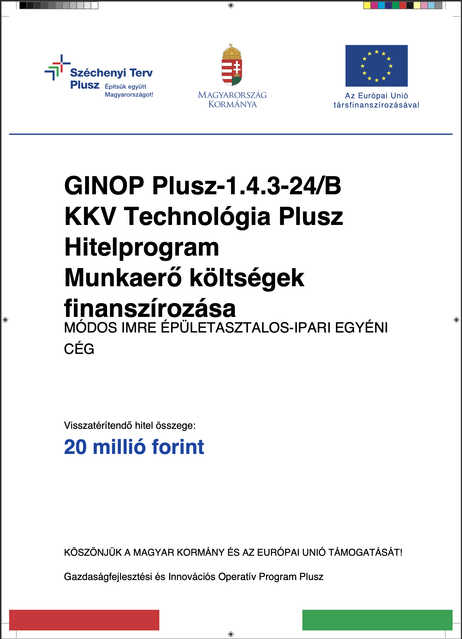 Kedvezményezett neve: Módos Imre Ec. Visszatérítendő hitel összege: 20 millió Ft A projekt megvalósítási ideje: 2025.07.01 – 2026.06.30. Projekt azonosítószáma: GINOP Plusz- 1.4.3-24 KKV Technológia Plusz Hitelprogram_B